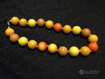 Collana vintage anno 1973, Altissima bigiotteria di qualità, in condizioni perfette, il metallo dorato è rimasto identico, sembra oro, le perle di legno colorato raffinatissime intervallate da perline dorate che le mantengono separate. La chiusura dorata e perfettamente funzionante. È adattabile in vari stili dando un tocco Chic e colore su ogni capo.