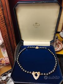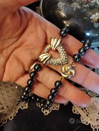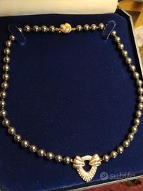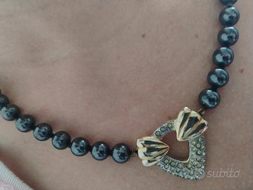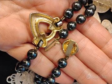 Raffinata collana vintage originale anni ’80, espressione della bigiotteria di qualità dell’epoca, quando anche il non-prezioso veniva trattato con rispetto quasi artigianale “di fascia alta” quella che oggi chiamiamo costume jewelry. Realizzata con perle in vetro pesanti color grigio antracite luminose, lisce e fredde al tatto, dettaglio che ne conferma la buona manifattura, infilate con tecnica tradizionale e annodate a mano una ad una. Elemento centrale a forma di cuore aperto con fiocco decorativo in rilievo. NO Poste Italiane 🚫 oggetto di valore Il design è impreziosito da un elegante ciondolo centrale a forma di cuore stilizzato (circa 3 x 3 cm), decorato con micro rilievi luminosi, e da una chiusura importante e decorativa. La scatola da oreficeria in foto NON è compresa, la trovate in vendita tra gli annunci. MISURE Lunghezza collana chiusa: 48 cm Dimensioni ciondolo: circa 3 x 3 cm Diametro chiusura: 1,3 cm Peso: 74 g Eccellenti condizioni indossata pochissimo e sempre conservata con cura in portagioie. Spedizione accurata e veloce
