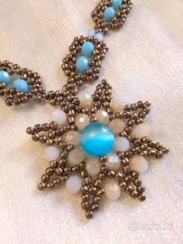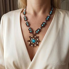 Collana intessuta a mano Art Déco in Bronzo e Occhio di Gatto Questa collana in stile vintage si distingue per una struttura realizzata con la tecnica del bead weaving, che intreccia le singole componenti per formare una maglia robusta e complessa. I materiali selezionati includono elementi color bronzo anticato e piccoli cristalli cechi azzurri, disposti con regolarità lungo tutta la lunghezza del gioiello. Il punto focale è costituito da un pendente a forma di stella che racchiude una pietra di occhio di gatto in tonalità turchese, celebre per i suoi riflessi di luce cangianti. Con una lunghezza di 45 cm, questa creazione è pensata per chi predilige materiali classici e un design che richiede estrema precisione esecutiva.