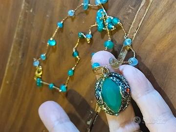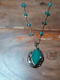 Bellissima collana vintage con pietre dure verdi simil giada e bellissimo ciondolo anch'esso in pietra dura verde contornato da simil brillanti e simil rubini. Lunghezza collana da chiusa cm. 28,5. Lunghezza del ciondolo cm. 2,5. In ottime condizioni.