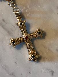 Il disegno complessivo richiama la gioielleria devozionale tra la fine dell’Ottocento e i primi del Novecento, oppure raffinate produzioni vintage ispirate agli ornamenti religiosi storici.