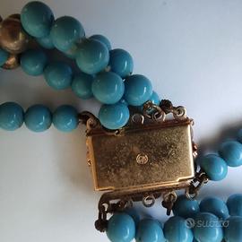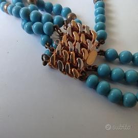 Questa collana vintage a più fili, caratterizzata da perline color turchese alternate a sfere dorate e da una chiusura lavorata in stile retrò, è l’accessorio perfetto per chi ama un look raffinato ma vibrante.