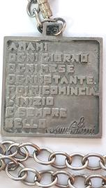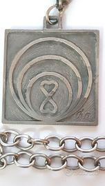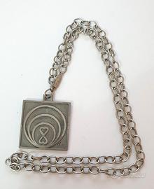 Bellissima collana vintage in acciaio, con ciondolo a forma di piastrina con frase d’amore “Amami ogni giorno, ogni mese, ogni istante. Poi ricomincia. L’inizio è sempre bello“. Sull’altro lato del ciondolo 3 circonferenze interne con 2 cuori.