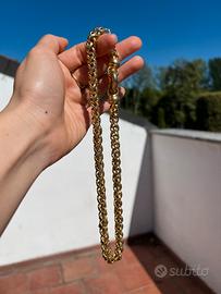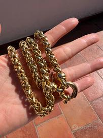 Bellissima e imponente collana vintage con lavorazione bizantina (a gabbia per uccelli). Si tratta di un gioiello di alta qualità, pesante e di grande pregio. Ha un peso notevole e un aspetto molto lussuoso al collo. • Design: Intricata lavorazione bizantina/etrusca. • Peso: Pesante (circa 94 grammi). • Condizioni: Condizioni vintage. Si noti un leggero scolorimento della placcatura in oro nei punti di innesto/maglie, che le conferisce una piacevole patina vintage. Nessun punzone o marchio presente. • Chiusura: Chiusura a moschettone grande. • Lunghezza: circa 45 cm. Perfetta per chi ama l'audace look "oro italiano" senza il prezzo dell'oro massiccio. Venduta così com'è. #BigiotteriaVintage #MagliaBizantina #CollanaDonna #ColorOro #VintageStyle #CollanaPesante #AccessoriVintage #ModaDonna #collana #collanadorata #collanacatena #collanaelegante #collanacorta #collanaclassica #accessoridonna #bijoux #collanamoda #gioiellidonna