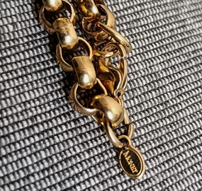 Elegante collana vintage firmata Monet, celebre marchio di costume jewelry americana. Modello a maglia rolo con anelli rotondi uniformi e finitura dorata (gold tone). Lunghezza circa 90 cm (opera length): può essere indossata lunga oppure doppia sul collo. Targhetta originale MONET presente e ben leggibile. Collana piuttosto pesante (circa 88 g), indice della buona qualità costruttiva tipica del marchio. Condizioni vintage ottime, con normali lievi segni del tempo ma doratura ancora brillante. Spedizione accurata e imballaggio protetto.