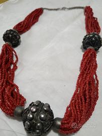 Collana vintage con perline in vetro color corallo con applicazioni etniche in metallo. Collana multifilo con perline di vetro color corallo rosso e grandi perline tribali in metallo.