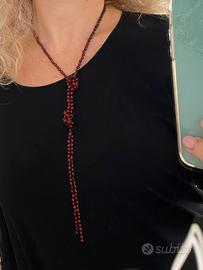 Originale collana in perline in legno o semini colorati rosso bordeaux e nero, lunga e aperta, si può annodare all’altezza desiderata creando varie combinazioni. Nella da sola o portata con altre collane simili.