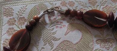 Collana di gusto un po' etnico con perle di dimensioni e colori vari nelle tonalità tabacco, beige e nero.