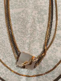 collana vintage multifilo in tonalità bicolore canna di fucile e oro con elemento di chiusura geometrico in madreperla impreziosito da punti luce