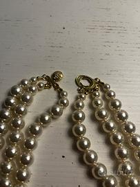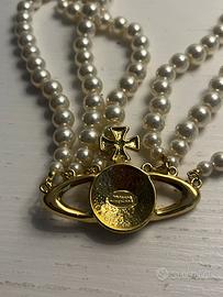 Collana Vivienne Westwood originale, iconico modello con tre fili di perle color avorio e celebre pendente Orb dorato con cristalli.
