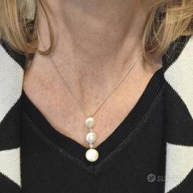 Magnifica collana YVEL iconica del lusso americano famosa in tutto il modo, realizzata in oro massiccio bianco 18 carati, impreziosita da pendente centrale con 3 perle a bottone, n. 3 diamanti taglio brillante GCOLOR VVS per 0.05 carati.
