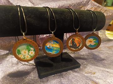 Collane con ciondoli in legno dipinti a mano. Regolabili in lunghezza con chiusura a moschettone. Pezzi unici. Confezione regalo. Prezzo 10 euro cadauna.