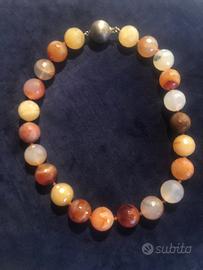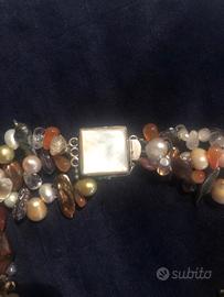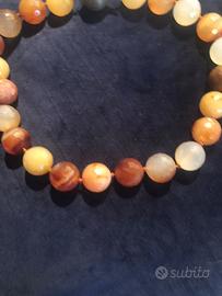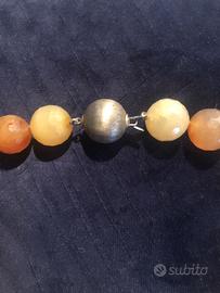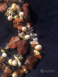 Collane di pietre dure e perline: la prima a tre fili con fermaglio gioiello in argento e madreperla, la seconda monofilo con pietre lavorate a boule con fermaglio rotondo.
