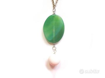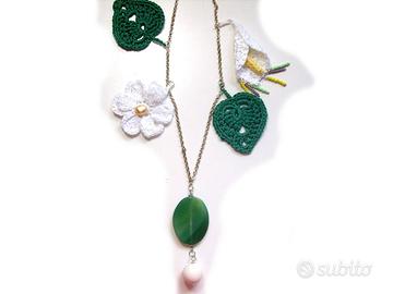 collanina con pietre naturali, ovale in agata verde e sfera in agata bianca, fiori e foglie lavorate all'uncinetto, catenina in metallo color argento