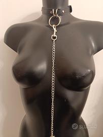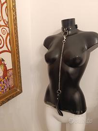 Collare in pelle con guinzaglio in acciaio e manico in pelle nera nuovo mai utilizzato