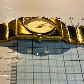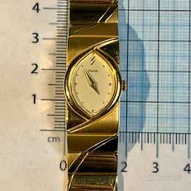 Splendido orologio da donna Pulsar V810-6650 vintage, anni '80, in eccellenti condizioni! Design elegante "cocktail watch" con cassa ovale e bracciale rigido placcato oro, perfetto per collezionisti o come pezzo unico. Affidabile quarzo giapponese Seiko, icona dell'oro-logeria vintage. Dati Tecnici Dettagliati: • Marca e Modello: Pulsar V810-6650 (by Seiko) • Movimento: Quarzo V810 (Japan Quartz, MOV'T JAPAN), ultra-sottile 5-1/2 × 6-3/4 ligne, spessore 3mm • Cassa: Ovale allungata base metal placcato oro (Base Metal Steel Back), dimensioni ca. 25-30mm lunghezza × 15-20mm larghezza (da righello foto) Quadrante: Bianco madreperla-style con lancette dorate, indici minimal, logo Pulsar e fulmine • Vetro: Minerale piano • Bracciale: Rigido placcato oro con motivi obliqui intrecciati, chiusura deployant, lunghezza ca. 15-18cm (regolabile) • Fondocassa: "Pulsar", "Base Metal Steel Back", "V810-6650", "MOV'T JAPAN" • Polsino: Adatto a polsi fini, peso leggero Condizioni: Estetica perfetta, placcatura integra (lievi segni vintage)