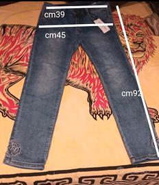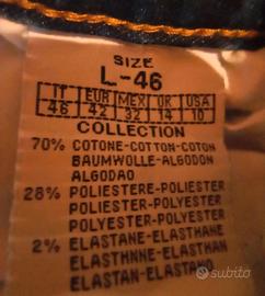 Collection - Jeans Donna con Ricamo Rosa e Strass. Taglia 46 it Bellissimi jeans da donna in denim blu firmati COLLECTION, caratterizzati da un esclusivo dettaglio a fondo gamba: un raffinato ricamo a forma di rosa con lavorazione traforata, impreziosito da punti luce (strass) applicati su tutta la parte finale. Ideali per un look casual ma ricercato, perfetti da abbinare sia con sneakers che con un tacco per valorizzare il ricamo alla caviglia. Dettagli del Prodotto: Stato: Nuovo con cartellino (mai indossato). Colore: Denim Blu medio con leggero lavaggio sfumato sulle cosce. Materiale: Tessuto elasticizzato e confortevole. 70% Cotone 28% Poliestere 2% Elastane Taglia: 46 IT (L) EUR 42 Misure Precise (prese in piano): Per garantirti la massima precisione nella vestibilità, ecco le misure rilevate: Vita: 39 cm Fianchi: 45 cm Lunghezza totale: 92 cm Nota: Il taglio è moderno, leggermente a sigaretta, con una vestibilità che valorizza la figura grazie alla componente elastica. 💫 In allegato l'immagine dimostrativa della vestibilità dei jeans