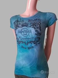 New York 1, azzurra, scritta nera e argento e brillantini, taglia XS, 95% cotone, 5% spandex