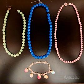 Collana di perle rosa, collana di perle blu, collana di perle verde chiaro, bracciale con charm a fragola, pendenti decorati con strass ecc. come da foto. Si spedisce con bella scatola in raso verde e coperchio placcato argento. Condizioni come da foto, mancano alcuni fermagli, ha un filo da sostituire