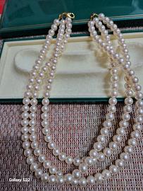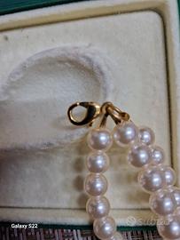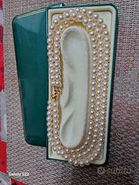 molto elegante, perle alta bijoutteria, anni 80, usata pochissimo, chiusura moschettone (piccolo) dorato. Per correttezza dico che il moschettone si chiude ma va' accompagnato per sicurezza di chiusura. Ancora nella sua scatola cn piccolissimi (ma quasi invisibili) segnetti del tempo. Collana elegante e di effetto...No consegna a mano