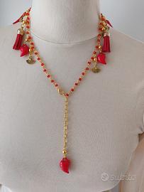 Collana "Miss Peperoncino" stile boho folk kitsch con peperoncini rossi portafortuna, cuori rossi, cuore ex voto e ciondoli vari in ottone finitura goldtone.