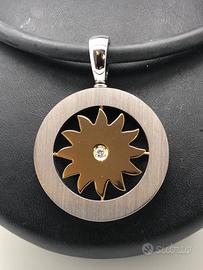 Centrale pezzo unico fatto a mano oro giallo e bianco18 KT Diamante taglio brillante colore H Cordone gomma chiusura oro 18 KT Peso : Gr 25 Diametro : cm 3,8 Altezza : cm 5,4 CERTIFICATO DI AUTENTICITA' PREZZO LISTINO ? 3.000 Central single piece handmade yellow and white gold 18 KT Brilliant cut diamond, color H Rubber cord with 18 KT gold clasp Weight: Gr 25 Diameter: 3.8 cm Height: 5.4 cm AUTHENTICITY CERTIFICATE' LIST PRICE ? 3.000