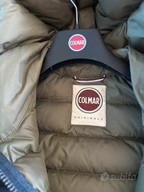Iconico piumino Colmar da uomo con cappuccio fisso realizzato in tessuto semi-lucido 100% riciclato e trattamento idrorepellente. Imbottito in piuma naturale con trapunti regolari. Fodera a contrasto, comode tasche laterali e pratica tasca interna.