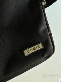 Borsa in tessuto con tracolla regolabile, tre tasche di cui una con strappo e due con cerniera, nuova con etichetta.