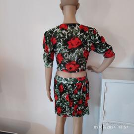 Vendo completino a fiori, in organza e maglina indossato pochissime volte, molto ben conservato, come nuovo, marca Galù by Cristina Belfiore, made in Italy, ottime rifiniture. La maglina ha due taschine chiuse con bottoncino rosso e la gonnellina ha la vita elasticizza che può essere indossata in vita o bassa sui fianchi. Misure maglina in cm: Spalle 42, manica 30 lunghezza 40, gonnellina: lunghezza 42. Taglia 40/42. Vero affare.