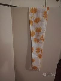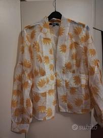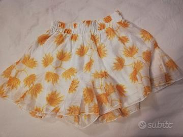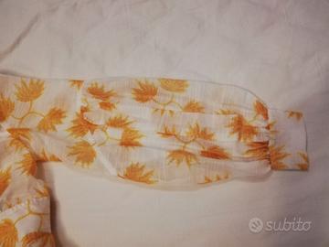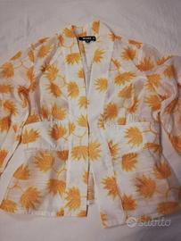 Completino donna : camicetta maniche lunghe e pantaloncini corti , MISS GUIDED , tg. S/M . Fantasia fondo bianco con foglie gialle . Tessuto 100% poliestere tipo organza leggerissimo . La camicia non ha bottoni ma si chiude tramite fascia alta dello stesso tessuto e colore del completo , visibile nell'ultima foto . Condizioni ottime , pari al nuovo . Disponibile ad inviare altre foto o informazioni .