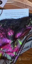 • Design: Raffinata stampa floreale astratta in tonalità fucsia e lime su base grigio seta, impreziosita da finiture in pizzo nero lavorato a ciglia.