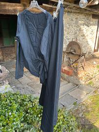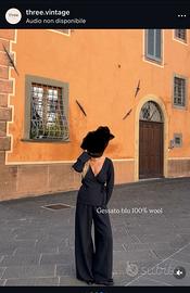 Pantalone a palazzo blue navy con elastico in vita 100% lana + maglia con incrocio blue navy 100% lana vergine. Entrambi taglia M. Three vintage è un brand italiano che utilizza solo tessuti naturali e vintage. Molto caldo. Vendibili singolarmente. Nuovo. Prezzo trattabile
