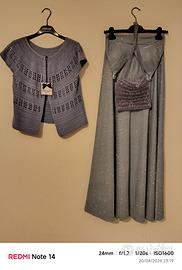 Completo abito lungo bolero uncinetto e poschette azzurro polvere e lurex