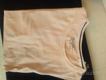 Coprispalla nero con fili dorati, t-shirt manica corta rosa pallido, pantalone nero plissettato con elastico in vita. Lunghezza pantaloni 90 cm, mentre gamba misurata dal cavallo 60cm. T-shirt usata di più, mentre il resto indossato pochissimo.