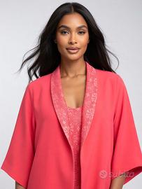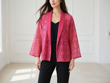 Completo in pizzo rosa con blaser reversibile in pizzo e cady con maniche a kimono 3/4, vestito in pizzo smanicato tg. 46, adatto in qualsiasi occasione, elegante, usato 1 sola volta, come nuovo