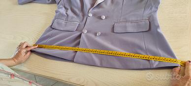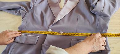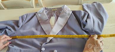 completo blazer doppio petto e pantaloni ampi. color Lavanda. revers bordato di raso tono su tono come le patatine della giacca. stoffa: chiffon e raso taglia 54