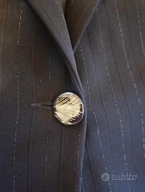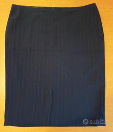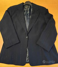 Completo tailleur Giacca+Gonna blu gessato lurex argento. Ottimo condizioni Giacca: Misure: larghezza da ascella ad ascella 58cm Lunghezza 72cm Gonna: Misure vedere foto. Piccolo spacco sul retro (vedere foto) Tessuto leggero con fodera interna.