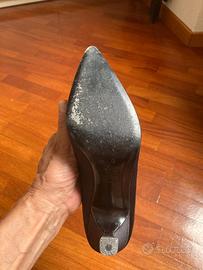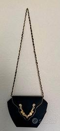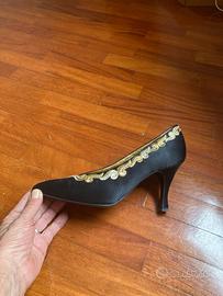 Décolleté raso nero decorato con Swarovski taglia 38, tacco 8 cm + Borsa Clutch abbinata con tracolla a catena largh. 23 cm, altezza 17 cm, prof. 5 cm.