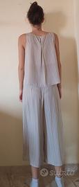 Completo canotta e pantalone in tessuto leggero e confortevole, perfetto per la primavera e l'estate. La canotta ha un taglio semplice e versatile con chiusura a bottone dietro, mentre il pantalone ha un taglio a palazzo che termina appena sopra la caviglia e ha una chiusura a zip sul lato.