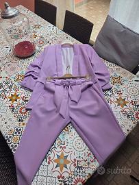 Completo ottimo x la stagione primaverile. C omprato e usato da mia figlia x la cresima della sorella e poi riposto nell'armadio. taglia s elastico e cintura tasche finte colore lilla