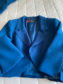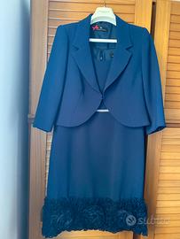 Abito foderato smanicato con applicazioni di strass al giro vita e di fiori e ruches sul fondo. Giacchina corta con maniche 3/4.Usato una sola volta. Mis. 44