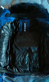 piumino in tessuto raso blu viola bianco in piuma d'oca con collo in pelliccia vera colore blu . taglia 46 ma veste bene anche una 44