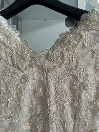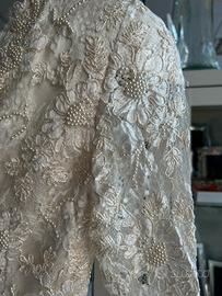 Bellissimo abito da sposa in pizzo macrame’ color burro su raso di seta, ricamato a mano con perline,completo di mantella lunga in raso di seta, scarpe artigianali in macrame’, cuscino porta fedi