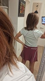 Pantagonna e maglietta per lo sport come nuove. La gonna ha una cintura con fibbia che può essere rimossa, l'interno è composto da pantaloncino con tasche per palline da tennis o paddle. Color borgogna taglia M. Maglia taglia L (Chi indosse veste taglia 38/40)