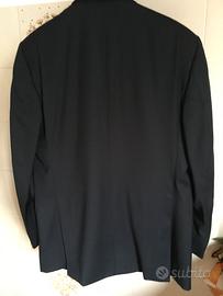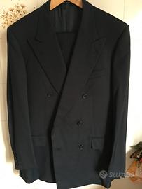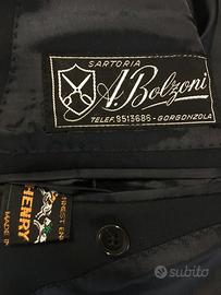Bellissimo completo da uomo classico, doppio petto, colore blu notte, ideale per cerimonia ed eventi importanti. Ottima fattura realizzato su misura da Sartoria A. Bolzoni. Stoffa come da etichetta Finest English Cloth by Henry Foster Misure giacca Larghezza spalle: 51 cm circa Lunghezza manica: 65 cm circa Lunghezza: 80 cm circa Tre tasche esterne, 4 interne e spacchi laterali. Pantalone classico con risvolto e pinces. Lunghezza dal cavallo 84 cm circa Circonferenza vita 96 cm circa Usato poche volte, in perfette condizioni. Se interessati non esitate a contattarmi.