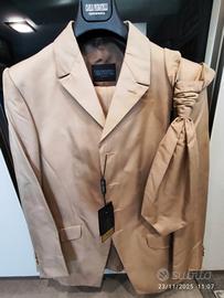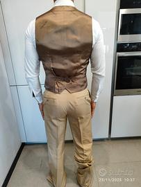 Bellissimo completo da uomo cerimonia di Carlo Pignatelli colore beige, taglia 48, comprensivo di pantalone, gilet, giacca e cravatta. 66% Poliestere e 34% seta. È inoltre inclusa una camicia in seta Danesi, taglia 43/17: nelle foto non è indossata la camicia in seta di Danesi per evitare di ombrarla.