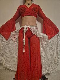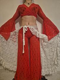 Completo in pizzo rosso composto da pantalone e top ad incrocio per danza orientale e balli caraibici. In aggiunta la gonna in pizzo bianco che spezza e dà movimento..