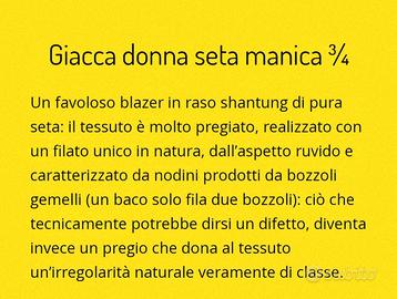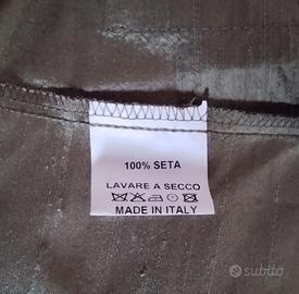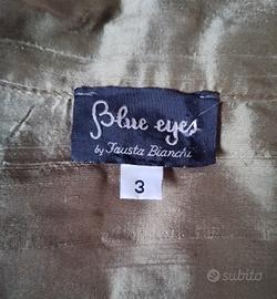 Bellissimo completo donna composto da giacca con manica 3/4 e pantalone color verde cachi. Brand Blue Eyes. Tessuto 100% seta. Fresco e leggero sulla pelle. Taglia 44 (da verificare in base alle misure sotto riportate). PANTALONE con chiusura a cerniera e bottone. Una finta tasca posteriore. Lunghezza totale 97 cm Circonferenza vita 84 cm GIACCA con chiusura centrale ad un bottone con due tasche. Lunghezza totale 55 cm Spalle 40 cm Circonferenza petto 52 cm Lunghezza maniche 47 cm Pagamento in contanti (o da concordare preventivamente). Ritiro a mano a Torino (zona Mirafiori Sud) oppure Beinasco.