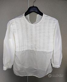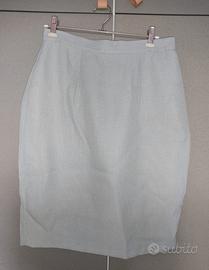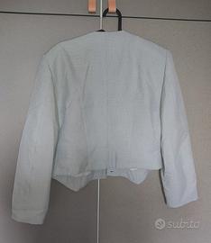 Bellissimo completo donna di manifattura artigianale italiana composto da gonna dritta fino al ginocchio con sottogonna,bottone e cerniera sul retro; Giacca in stuoia verde salvia,scollo a triangolo,fit dritto, più corta dietro e con punte sul davanti che allungano la figura, completa dei suoi 5 bottoni in madreperla. All' interno fodera tono su tono. Inoltre completa della sua camicetta bianca plissettata sul davanti di color bianco. Completo 20% viscosa. Il completo non ha nessun difetto,indossato una sola volta. Molto piacevole al tatto e contatto con la pelle. Taglia 44, ma scrivetemi per le misure precise. Spedisco in 24h con imballi e scatola idonea.