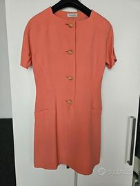 Completo in color rosa corallo chiaro composto da abito a mezze maniche con collo tondo, chiusura anteriore con bottoni e lunghezza sopra al ginocchio, + il suo soprabito scollo a V impreziosito da bottoni gioiello sul davanti e sulle maniche. Semplice, elegante e raffinato. Perfetto per cerimonie. Max Mara taglia 42. Tessuto di pregio. Indossato una volta.